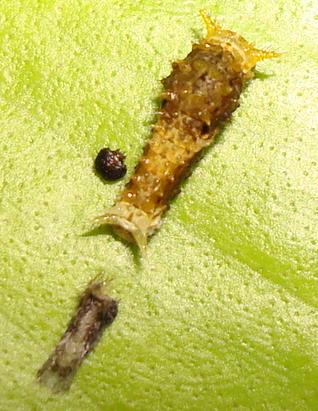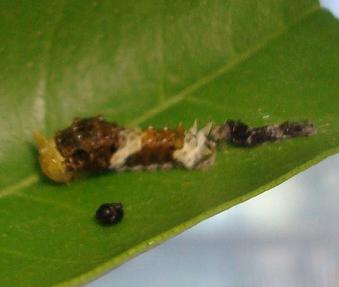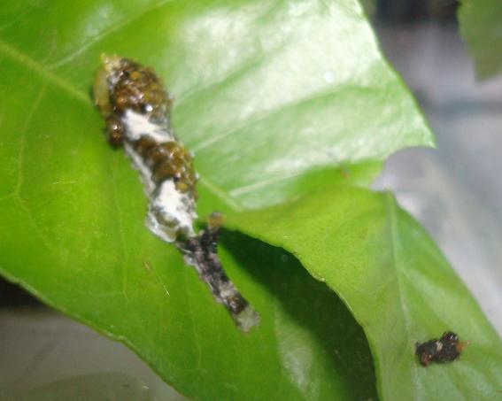 5月27日 22日にうちのユズで見つけた4つのタマゴ。 27日深夜0:30 孵化しました(*´∀`*)ノ 2つ目はその直後に孵化(10号) ナミだと思っていたけど生まれてみたらクロみたい♪ 5月31日 23:00 2齢に脱皮 6月4日 6:30 3齢に脱皮 6月7日 9:00 4齢に脱皮しました。 (画像右下のクロ14号が死亡していました) 6月10日 明日脱皮と思ってましたが20:00頃 脱皮済みでちょうど抜け殻を食べてました。 後ろに見えるのは10号です。日中までは 二人仲良く並んで休眠してました。