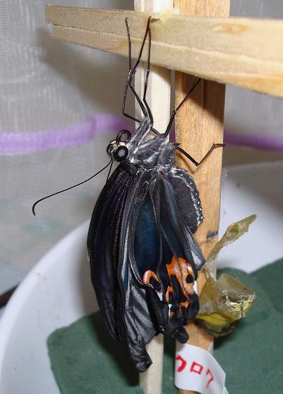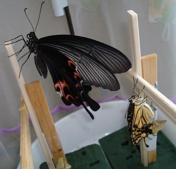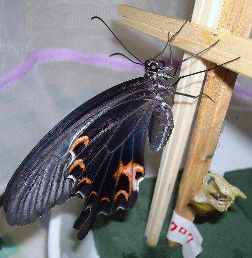 昨夜に引き続き夜間の羽化ですε=( ̄。 ̄;A フゥ… クロ7号 19時少し前 羽化直前です 19時過ぎ 昨夜の6号はおとなしかったけど7号は 早くも飛ぶ気満々( ゚д゚)ァラヤダ 朝まで待ってね( ̄Д ̄;υ)タラー… 6月20日 追記 朝、巣立ちの時を待っている間にナミ18号が羽化。 ナミアゲハとは格段に大きさが違います゚+.(ノ。・ω・)ノ*.オオォォ☆゚・:*☆ ベランダにて巣立ちを見計らっていましたが 自分の重さでズルズル花が垂れるので 落ち着かないようで、数分後に旅立ちました。 ヾ(*T▽T*)ヾ(*T▽T*)ヾ(*T▽T*) マタネーン!!