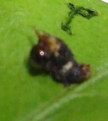★写真の赤丸の中、4齢への脱皮時に墜落して飛び出た臭角が最後まで