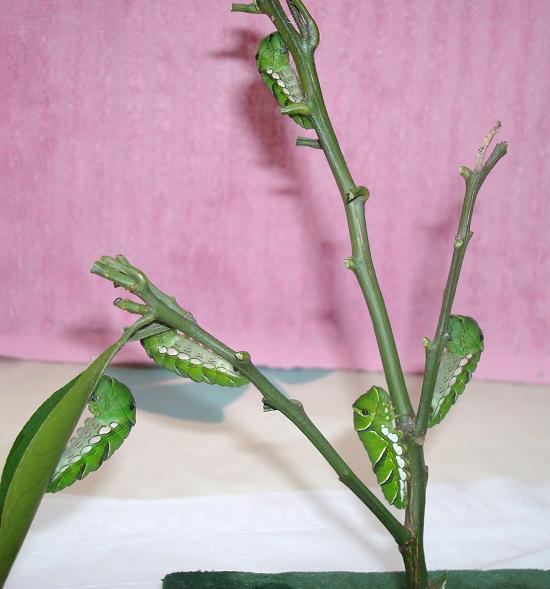 1つの食草の枝に密集して前蛹が!!!!!5体あります。